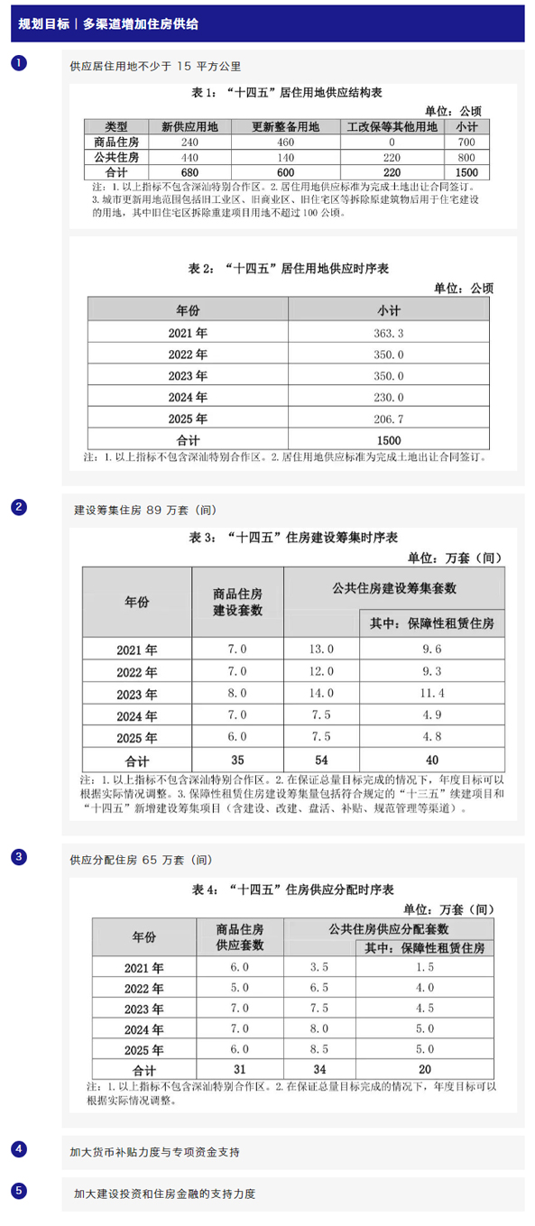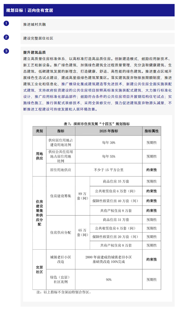 深圳市住房發展“十四五”規劃以供給側結構性改革為主線,以共生發展、共筑未來為思路,制定“保基本、廣覆蓋、促宜居”住房總體發展目標,明確供應居住用地不少于15 平方公里、建設籌集住房 89 萬套(間)、供應分配住房65 萬套(間)等具體指標,提出完善住房政策法規體系、加快發展保障性租賃住房、落實房地產市場健康發展長效機制、推進物業服務高質量發展、推廣綠色低碳宜居建筑等一系列發展策略,實現更高質量、更加公平、更可持續、更為安全的住房發展,不斷提升居住水平,逐步從住有所居向住有宜居邁進。